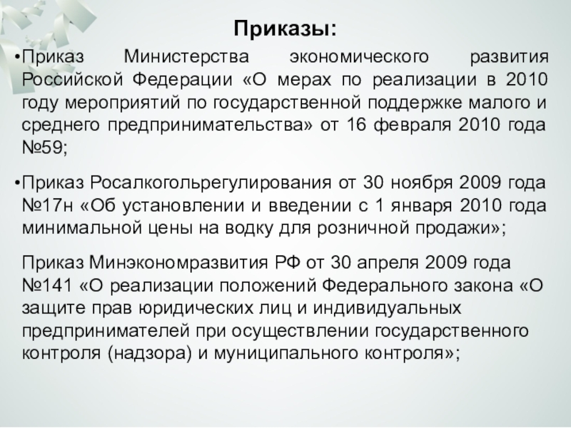 Приказ Минэкономразвития РФ от 30 апреля 2009 года №141 «О реализации положений Федерального закона «О защите прав юридических лиц и индивидуальных предпринимателей при осуществлении государственного контроля (надзора) и муниципального контроля»;