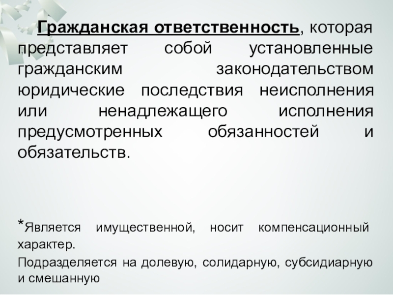 Слайд 46 Гражданская ответственность, которая представляет собой установленные гражданским законодательством юридические последствия