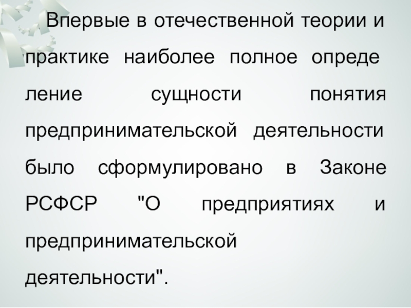 предпринимательской деятельности было сформулировано в Законе РСФСР "О предприятиях и предпринимательской деятельности".