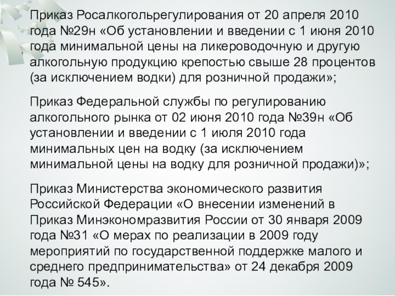 Слайд 35Приказ Росалкогольрегулирования от 20 апреля 2010 года №29н «Об установлении и