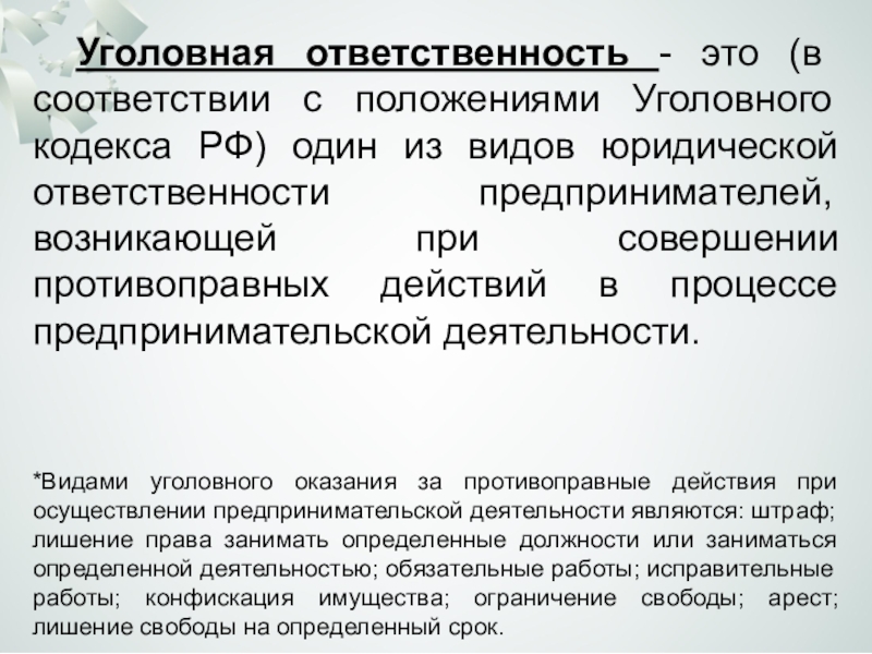*Видами уголовного оказания за противоправные действия при осуществлении предпринимательской деятельности являются: штраф; лишение права занимать определенные должности или заниматься определенной деятельностью; обязательные работы; исправительные работы; конфискация имущества; ограничение свободы; арест; лишение свободы на определенный срок.