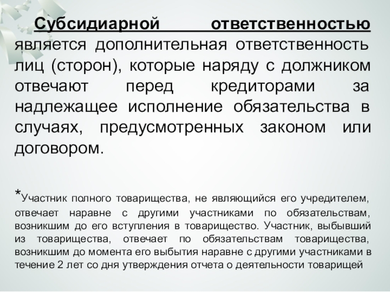 *Участник полного товарищества, не являющийся его учредителем, отвечает наравне с другими участниками по обязательствам, возникшим до его вступления в товарищество. Участник, выбывший из товарищества, отвечает по обязательствам товарищества, возникшим до момента его выбытия наравне с другими участниками в течение 2 лет со дня утверждения отчета о деятельности товарищей