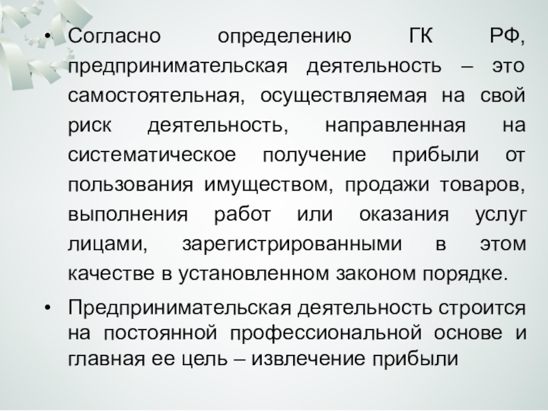 ГК ГФ комплексно определяет сущность предпринимательской деятельности, которой является самостоятельная, осуществляемая на свой риск деятельность, направленная ни систематические получение прибыли от пользования имуществом, продажи товаров, выполнения работ или оказания услуг лицами, зарегистрированными в этом качестве в установленном законом порядке.