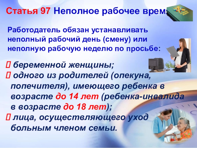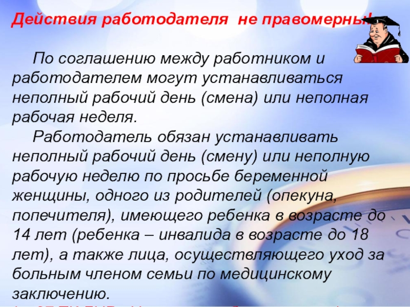 Работодатель обязан устанавливать неполный рабочий день (смену) или неполную рабочую неделю по просьбе беременной женщины, одного из родителей (опекуна, попечителя), имеющего ребенка в возрасте до 14 лет (ребенка – инвалида в возрасте до 18 лет), а также лица, осуществляющего уход за больным членом семьи по медицинскому заключению.