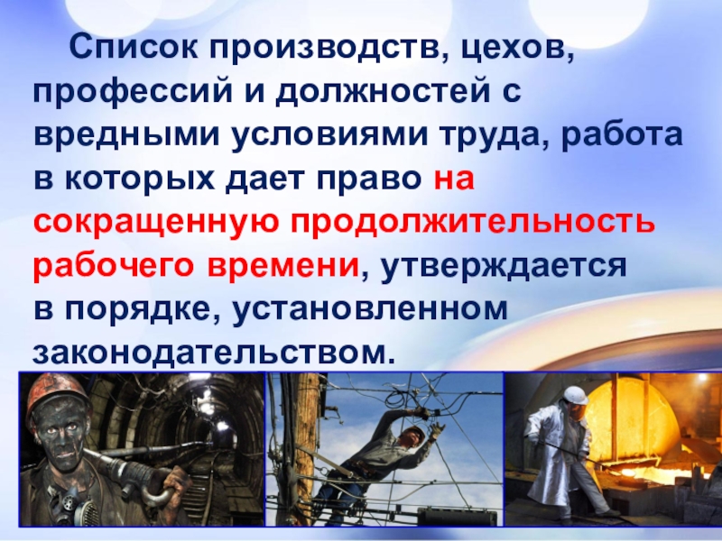 Слайд 12 Список производств, цехов, профессий и должностей с вредными условиями труда, работа