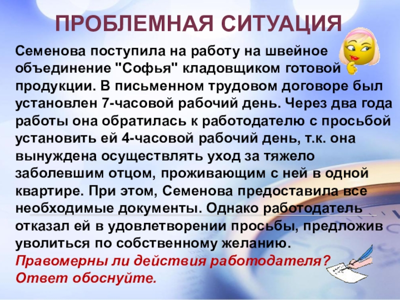 продукции. В письменном трудовом договоре был установлен 7-часовой рабочий день. Через два года работы она обратилась к работодателю с просьбой установить ей 4-часовой рабочий день, т.к. она вынуждена осуществлять уход за тяжело заболевшим отцом, проживающим с ней в одной квартире. При этом, Семенова предоставила все необходимые документы. Однако работодатель отказал ей в удовлетворении просьбы, предложив уволиться по собственному желанию.