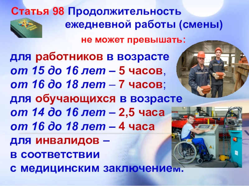 Слайд 19Статья 98 Продолжительность ежедневной работы (смены)