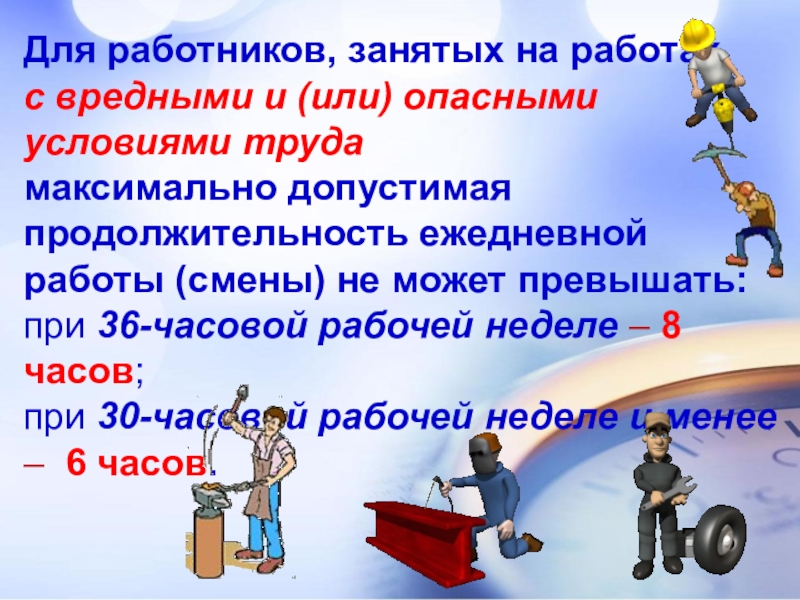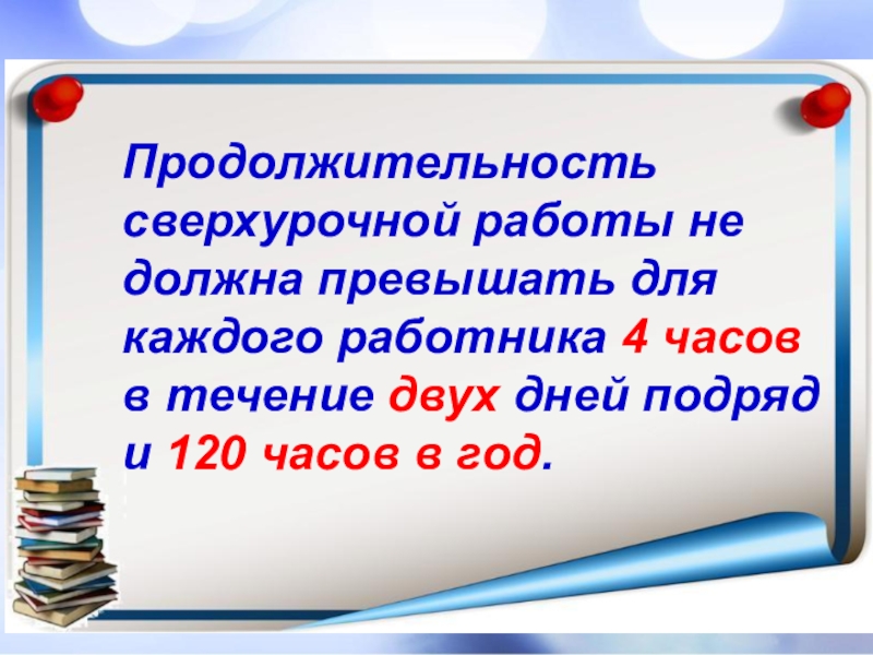 Слайд 29Продолжительность сверхурочной работы не должна превышать для каждого работника 4 часов