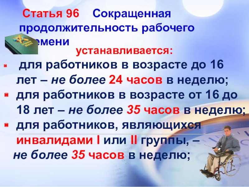 Слайд 10 Статья 96 Сокращенная продолжительность рабочего