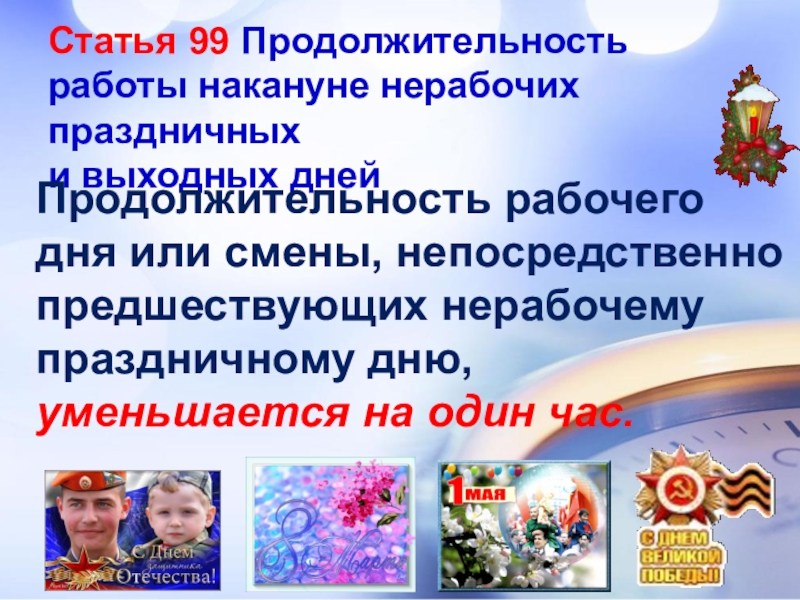Слайд 21Статья 99 Продолжительность работы накануне нерабочих праздничных