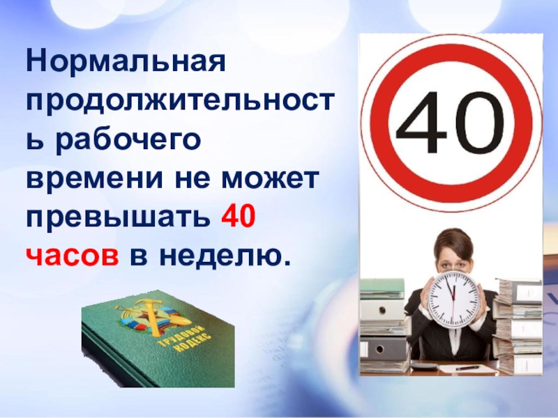 Слайд 9Нормальная продолжительность рабочего времени не может превышать 40 часов в неделю.