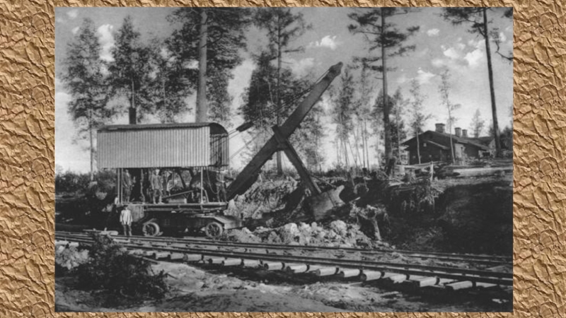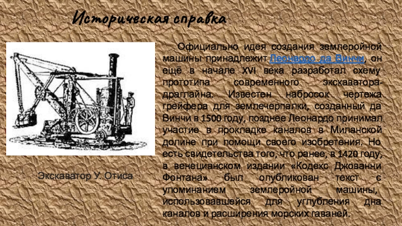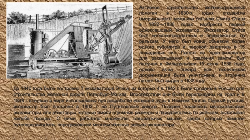 Активное строительство железнодорожных полотен в 1830-х годах сподвигла американского механика Уильяма Смита Отиса в 1832—1836 годах изобрести первый одноковшовый экскаватор. Экскаватор Отиса был неполноповоротным и передвигался по рельсам. У него был ковш объемом более одного кубометра и паровой двигатель в 15 лошадиных сил. Патент на "кран-экскаватор для раскапывания и удаления земли" был получен в Филадельфии 15 июня 1836 года, однако из-за пожара вся техническая документация была уничтожена, и вторично патент был выдан в 1838 году.