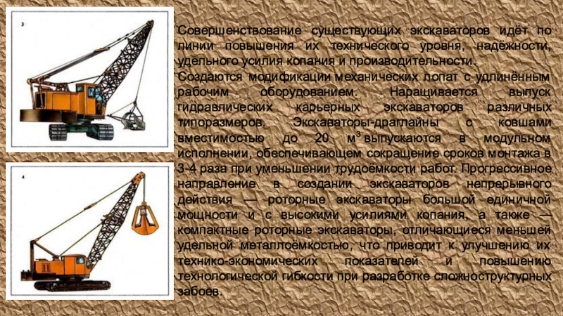 экскаваторы циклического действия (одноковшовые): одноковшовый экскаватор (в направлении зуба ковша экскаватора); рабочее оборудование: драглайн, прямая лопата, обратная лопата, грейфер;