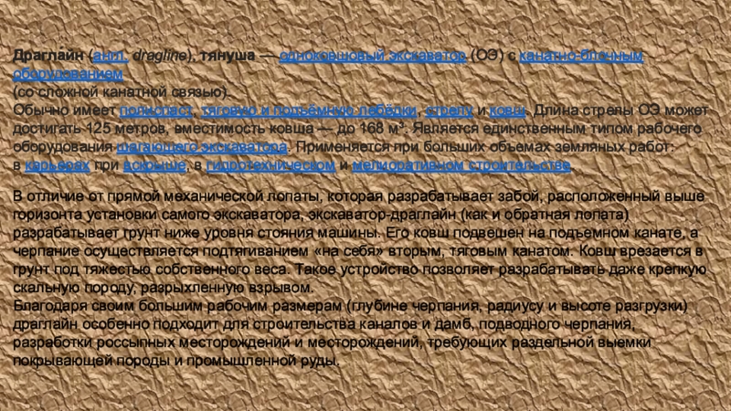 Драгла́йн (англ. dragline), тянуша — одноковшовый экскаватор (ОЭ) с канатно-блочным оборудованием