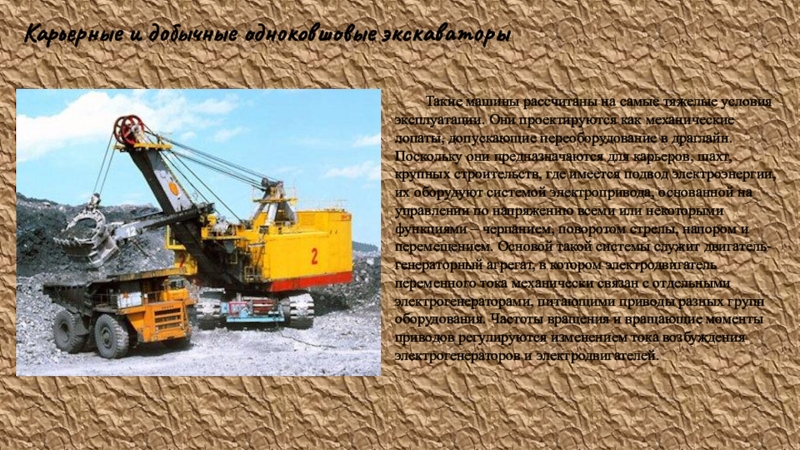 Одноковшовые экскаваторы различают в зависимости от вида выполняемых работ по направлению зубов ковша на машины с обратной и прямой лопатой. Экскаваторы, оборудованные прямой лопатой, чаще всего используют в карьерах для погрузки руды или других материалов в большегрузные автомашины.
