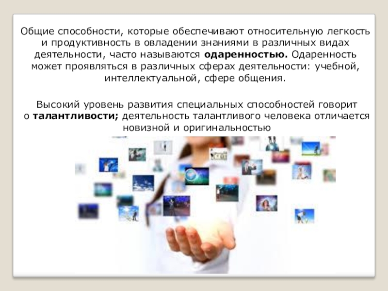 Высокий уровень развития специальных способностей говорит о талантливости; деятельность талантливого человека отличается новизной и оригинальностью