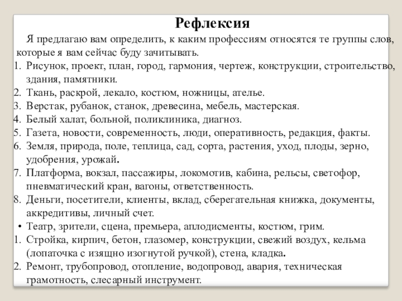 по отраслям народного хозяйства: профессии сферы образования, здравоохранения, обслуживания, сельского хозяйства, добывающей и перерабатывающей промышленности и прочие;