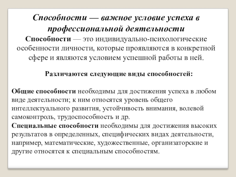 Общие способности необходимы для достижения успеха в любом виде деятельности; к ним относятся уровень общего интеллектуального развития, устойчивость внимания, волевой самоконтроль, трудоспособность и др.