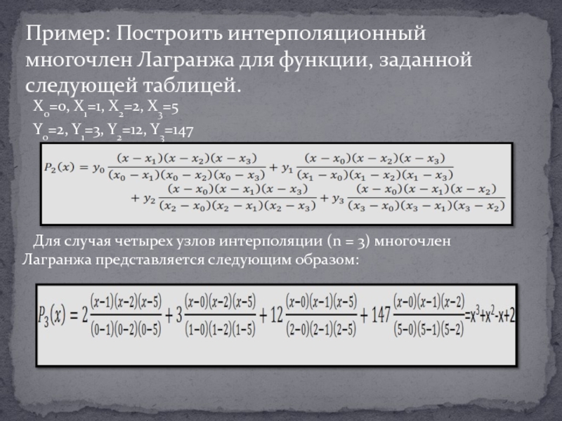 Для случая четырех узлов интерполяции (n = 3) многочлен Лагранжа представляется следующим образом: