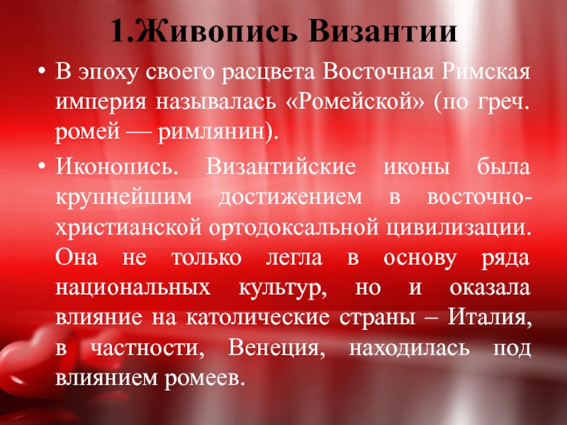 1.Живопись Византии В эпоху своего расцвета Восточная Римская империя называлась «Ромейской» (по греч. ромей — римлянин).Иконопись. Византийские