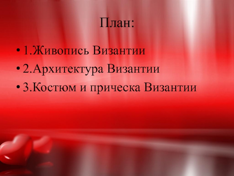 План:1.Живопись Византии2.Архитектура Византии3.Костюм и прическа Византии
