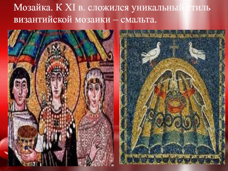 Слайд 7Мозайка. К XI в. сложился уникальный стиль византийской мозаики – смальта.