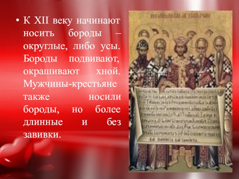 К XII веку начинают носить бороды – округлые, либо усы. Бороды подвивают, окрашивают хной. Мужчины-крестьяне также носили