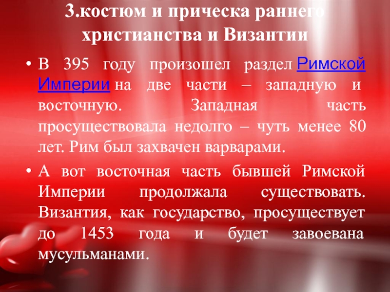 3.костюм и прическа раннего христианства и Византии В 395 году произошел раздел Римской Империи на две части – западную