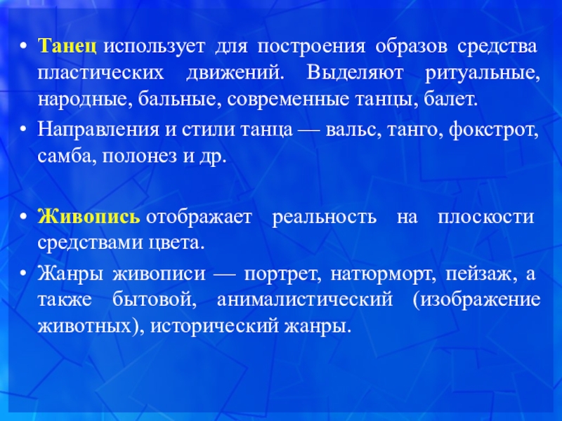 Танец использует для построения образов средства пластических движений. Выделяют ритуальные, народные, бальные,