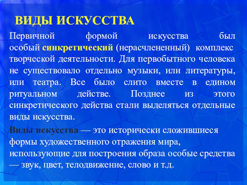 Первичной формой искусства был особый синкретический (нерасчлененный) комплекс творческой деятельности. Для первобытного