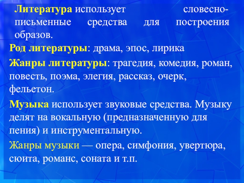 Слайд 8Литература использует словесно-письменные средства для построения образов.