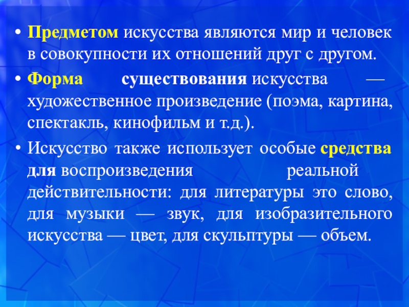 Предметом искусства являются мир и человек в совокупности их отношений друг с