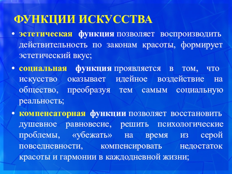компенсаторная функции позволяет восстановить душевное равновесие, решить психологические проблемы, «убежать» на время из серой повседневности, компенсировать недостаток красоты и гармонии в каждодневной жизни;