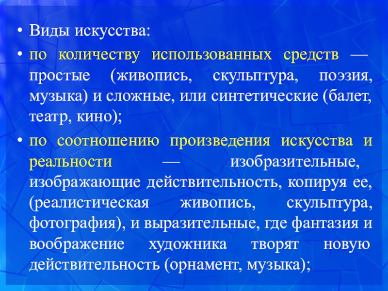 по соотношению произведения искусства и реальности — изобразительные, изображающие действительность, копируя ее, (реалистическая живопись, скульптура, фотография), и выразительные, где фантазия и воображение художника творят новую действительность (орнамент, музыка);