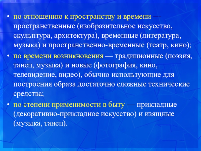 по отношению к пространству и времени — пространственные (изобразительное искусство, скульптура,