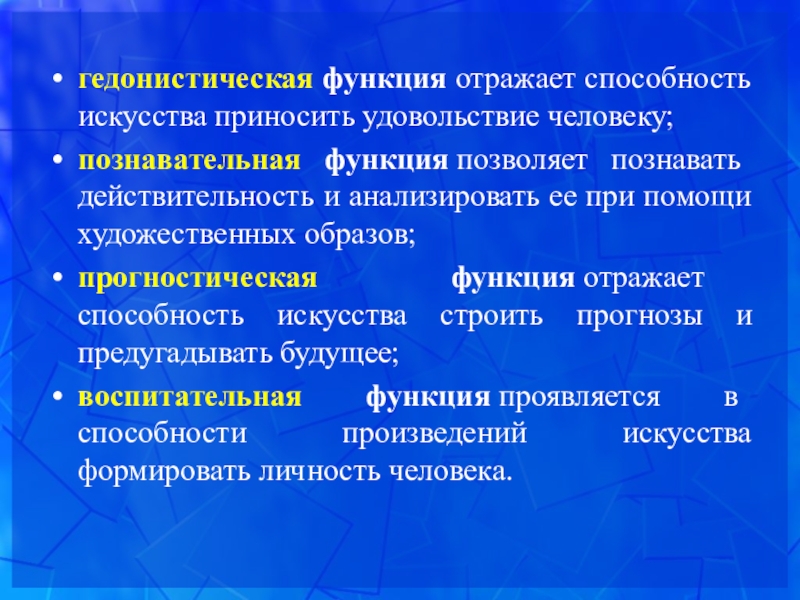 гедонистическая функция отражает способность искусства приносить удовольствие человеку;