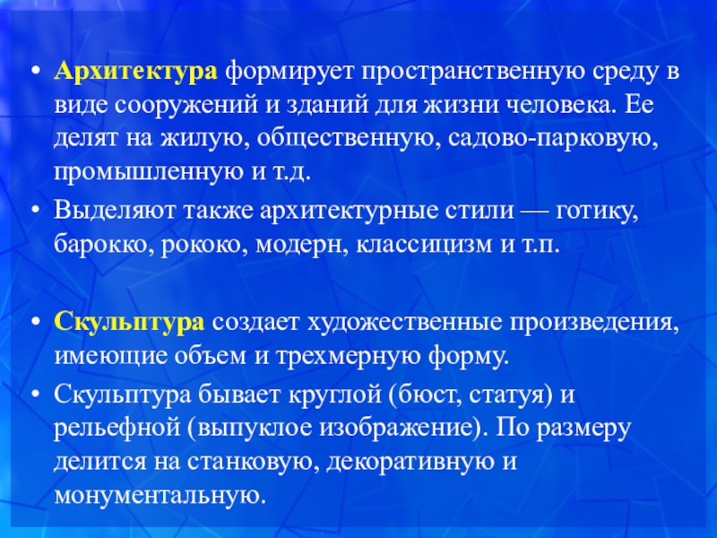 Архитектура формирует пространственную среду в виде сооружений и зданий для жизни человека.