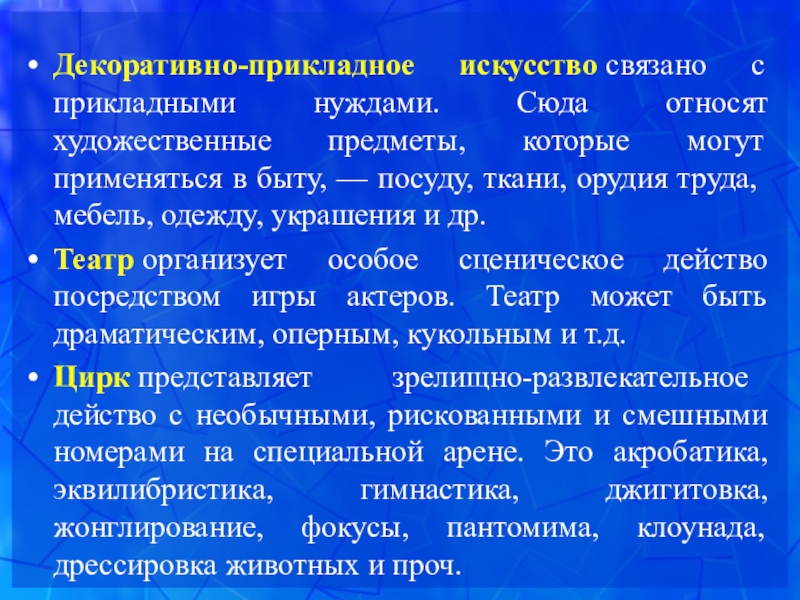 Декоративно-прикладное искусство связано с прикладными нуждами. Сюда относят художественные предметы, которые могут