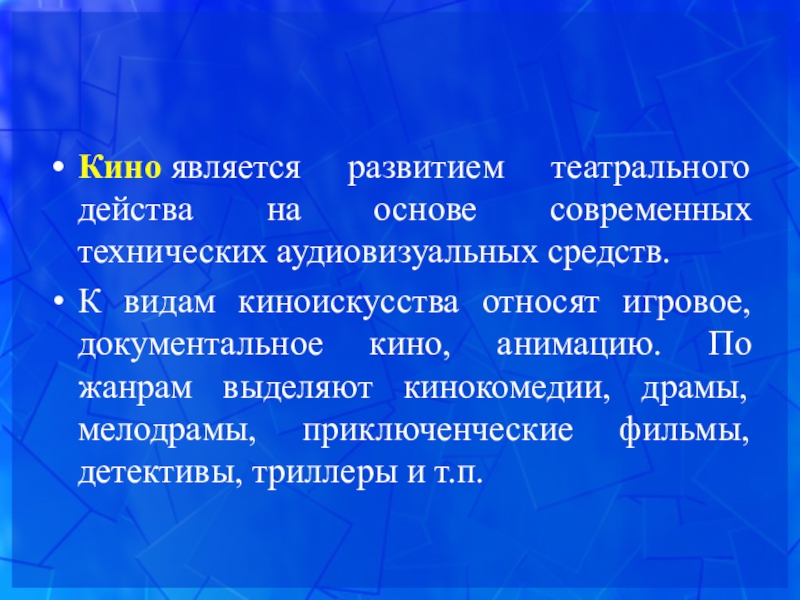 Кино является развитием театрального действа на основе современных технических аудиовизуальных средств.