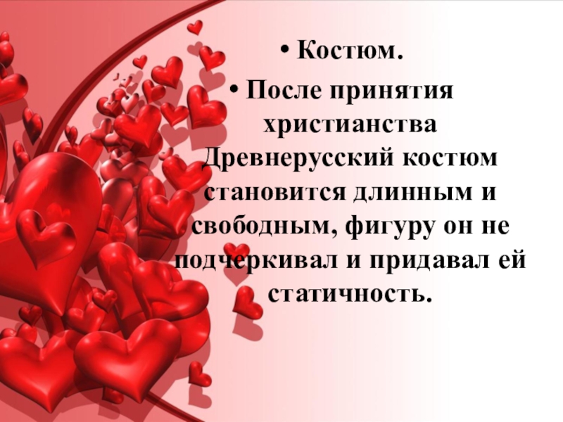 Костюм.После принятия христианства Древнерусский костюм становится длинным и свободным, фигуру он не подчеркивал и придавал ей статичность.