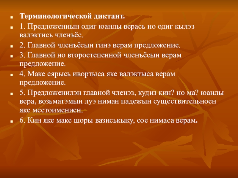5. Предложенилэн главной членэз, кудиз кин? но ма? юанлы вера, возьматэмын луэ ниман падежын существительноен яке местоимениен.