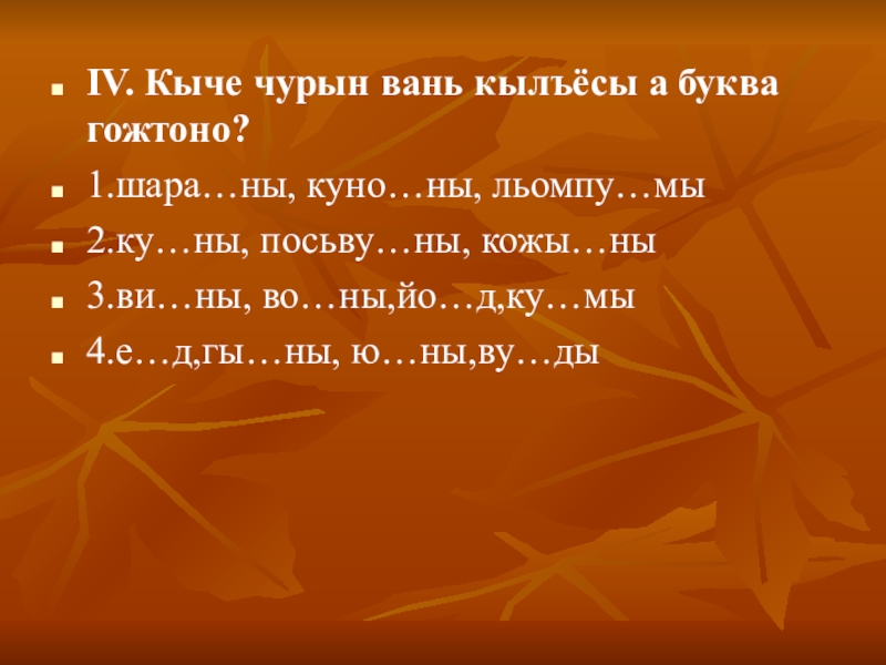 Слайд 5IV. Кыче чурын вань кылъёсы а буква гожтоно?
