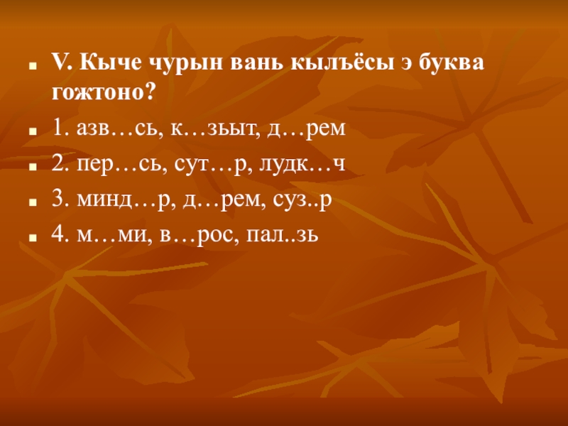 Слайд 6V. Кыче чурын вань кылъёсы э буква гожтоно?
