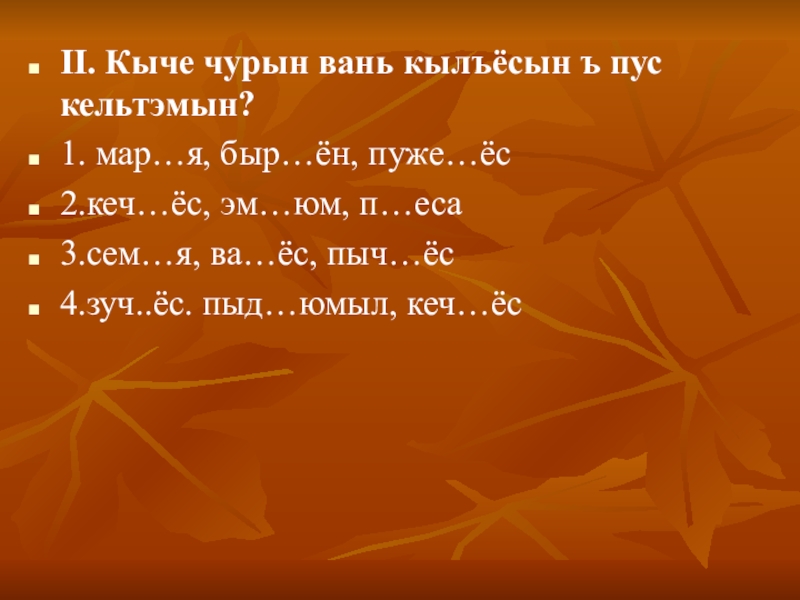 Слайд 4II. Кыче чурын вань кылъёсын ъ пус кельтэмын?