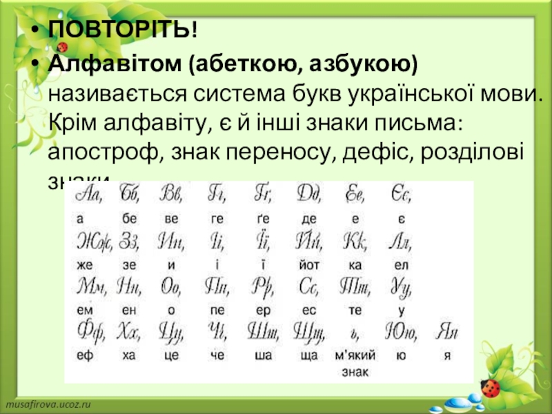 Алфавітом (абеткою, азбукою) називається система букв української мови. Крім алфавіту, є