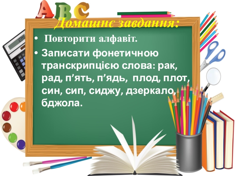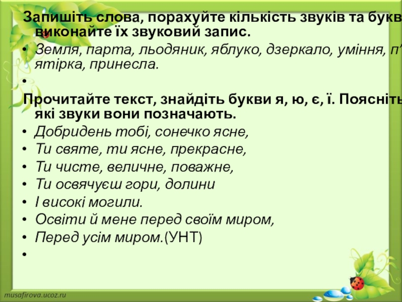 Слайд 15 Запишіть слова, порахуйте кількість звуків та букв, виконайте їх звуковий