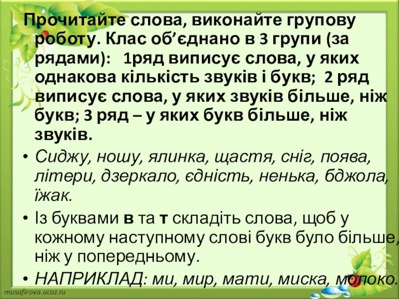 (за рядами): 1ряд виписує слова, у яких однакова кількість звуків і букв; 2 ряд виписує слова, у яких звуків більше, ніж букв; 3 ряд – у яких букв більше, ніж звуків.