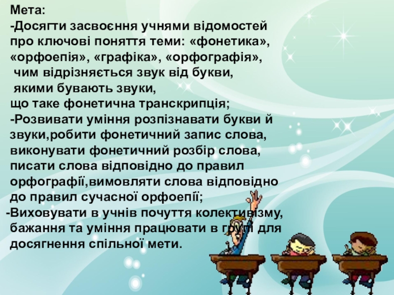 -Досягти засвоєння учнями відомостей про ключові поняття теми: «фонетика», «орфоепія», «графіка»,