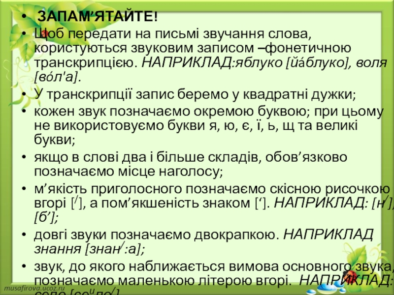 транскрипцією. НАПРИКЛАД:яблуко [йáблуко], воля [вóл'а].