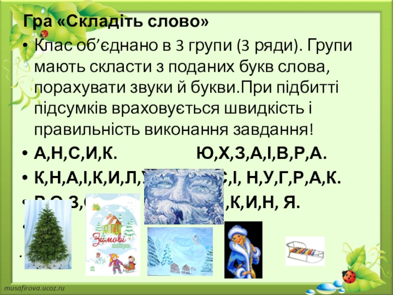 Групи мають скласти з поданих букв слова, порахувати звуки й букви.При підбитті підсумків враховується швидкість і правильність виконання завдання!